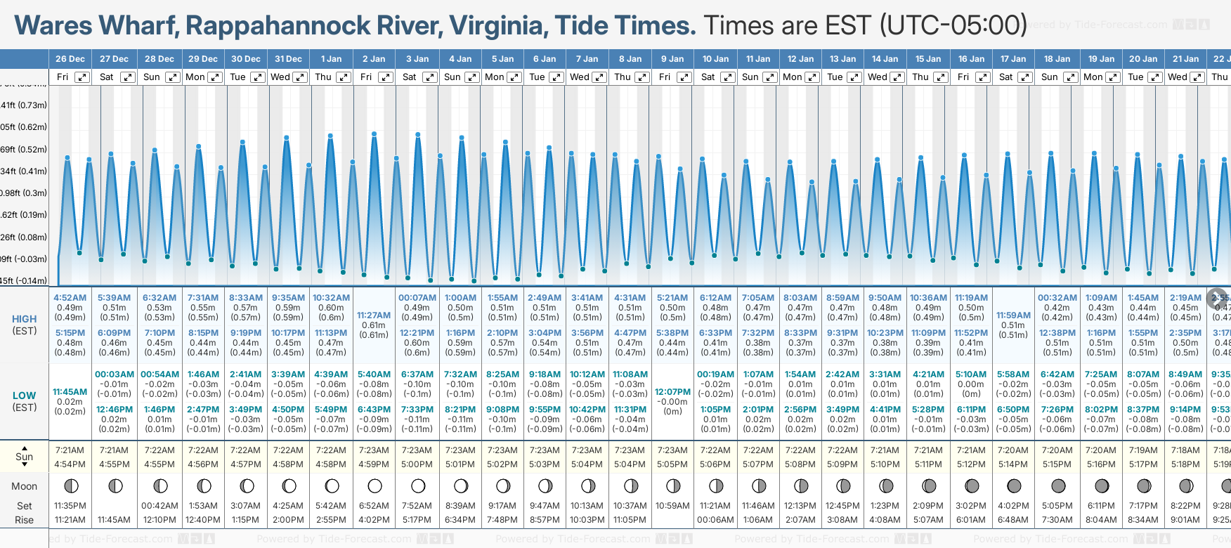 December and January Tide charts for Wares Wharf, Rappahannock River: The tide charts below show the height, time and date of high and low tides for the next 30 days.