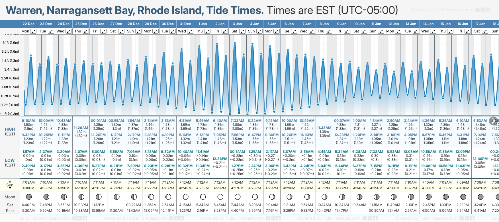December and January Tide charts for Warren, Narragansett Bay: The tide charts below show the height, time and date of high and low tides for the next 30 days.