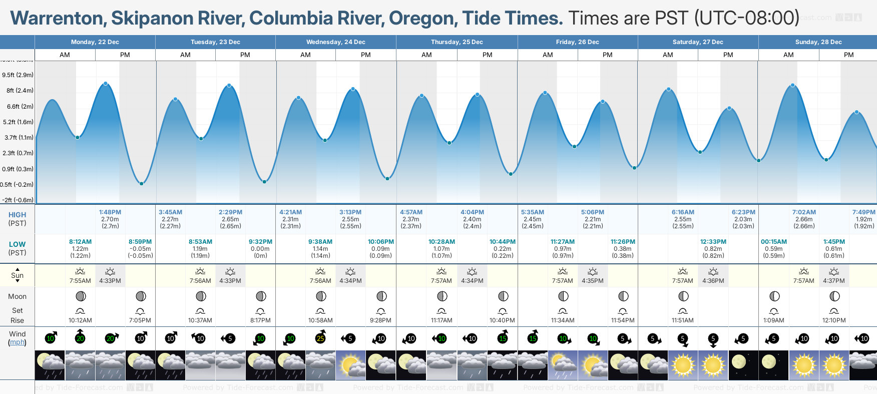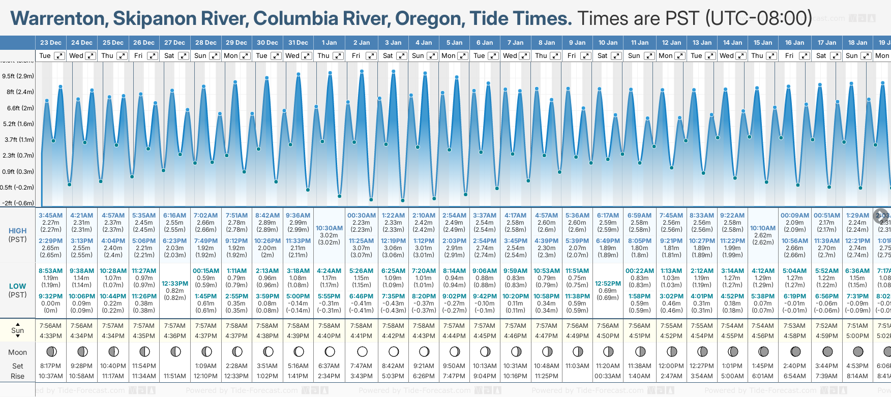 Tide chart for Warrenton, Skipanon River, Columbia RiverShowing low and high tide times for the next 30 days at Warrenton, Skipanon River, Columbia River. Tide Times are PST (UTC -8.0hrs).