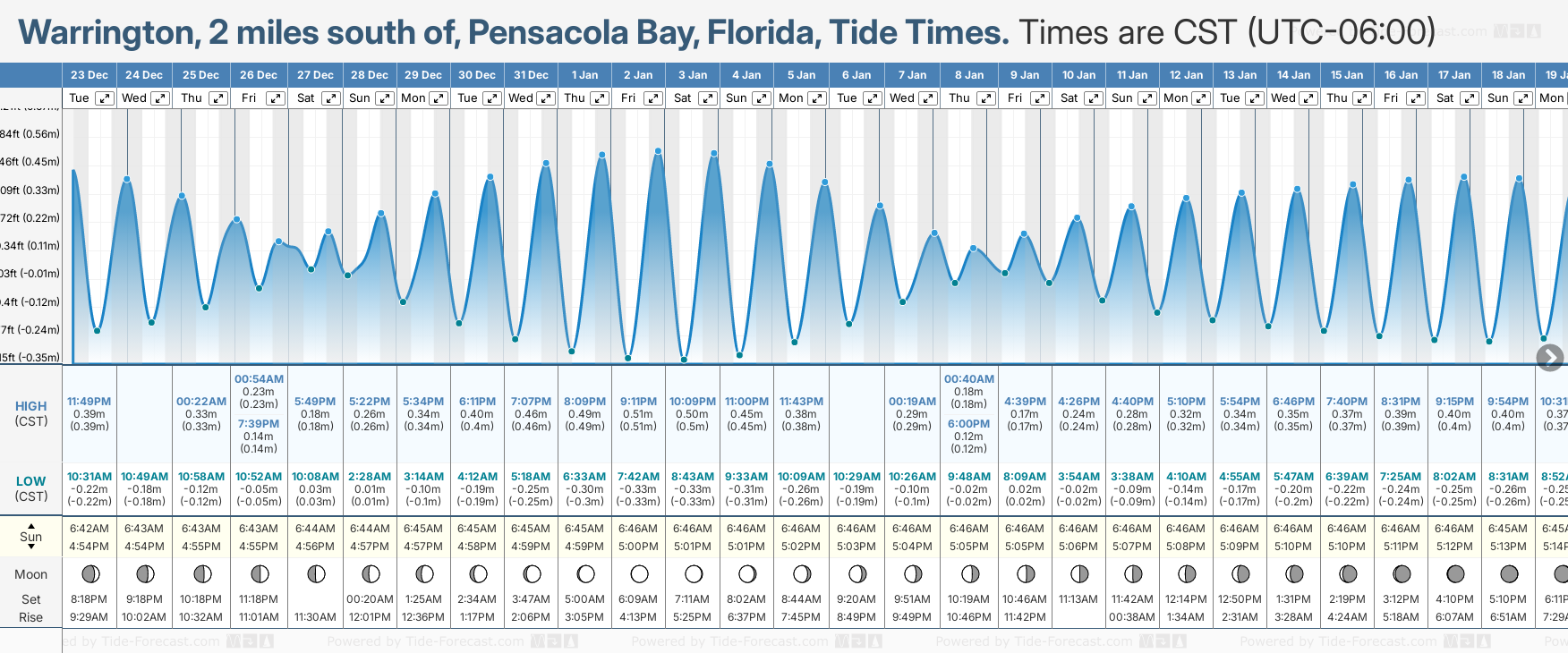 Tide Times are CST (UTC -6.0hrs). Last Spring High Tide at Warrington, 2 miles south of, Pensacola Bay was on Fri 05 Dec (height: 0.58m 1.9ft). Next high Spring Tide at Warrington, 2 miles south of, Pensacola Bay will be on Fri 02 Jan (height: 0.51m 1.7ft).