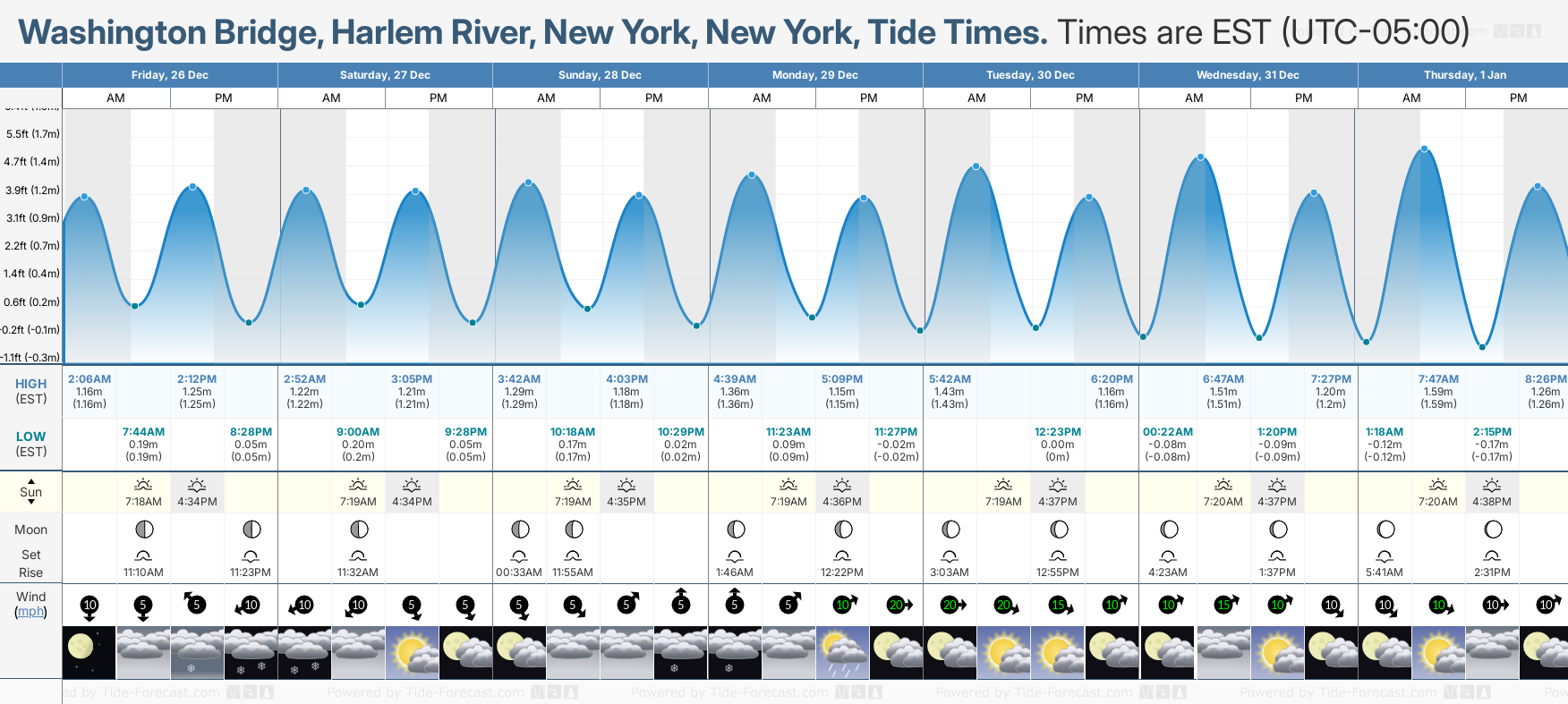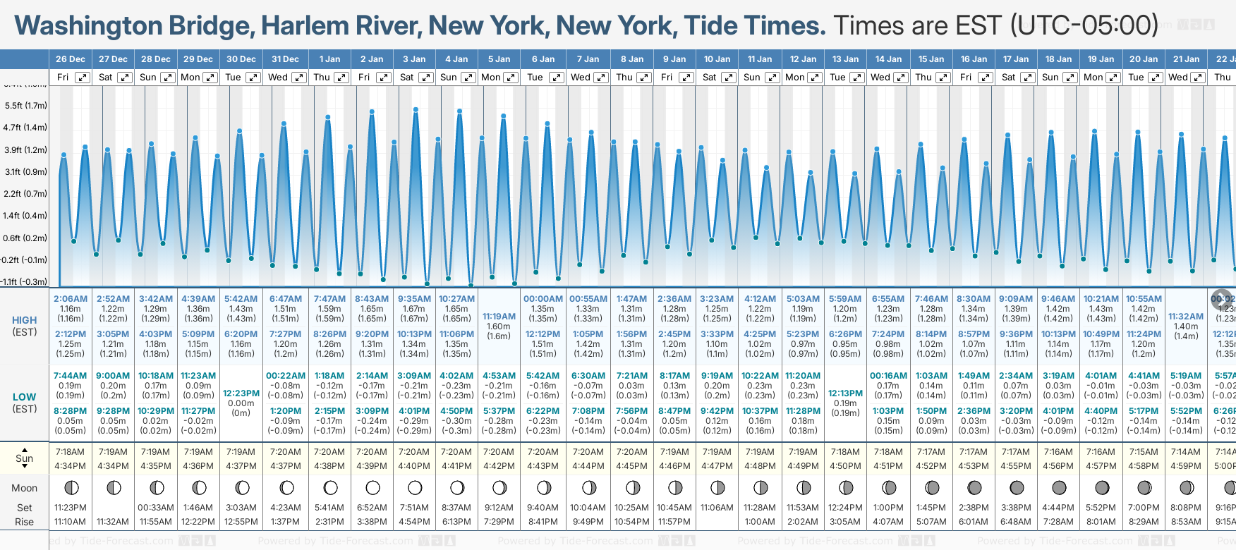 Tide chart for Washington Bridge, Harlem RiverShowing low and high tide times for the next 30 days at Washington Bridge, Harlem River. Tide Times are EST (UTC -5.0hrs).