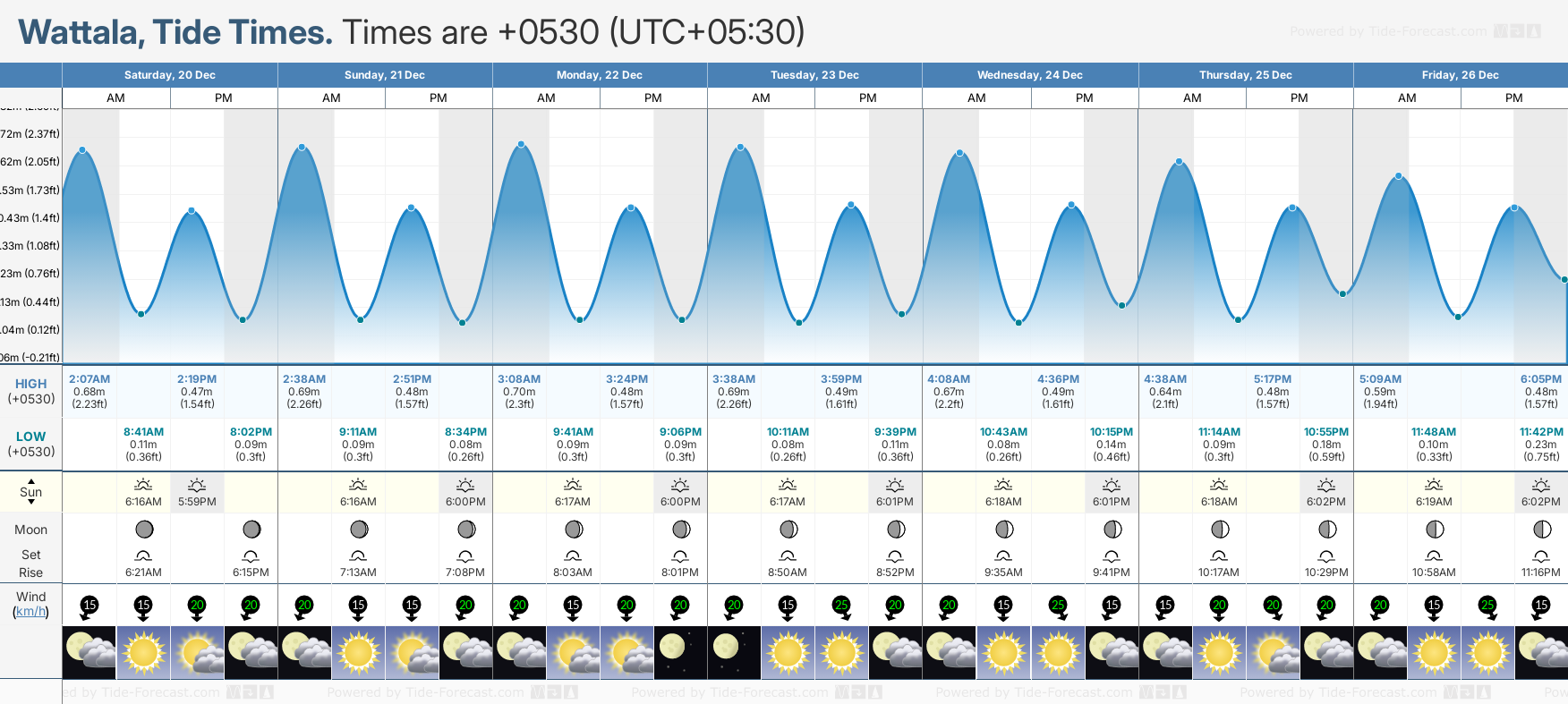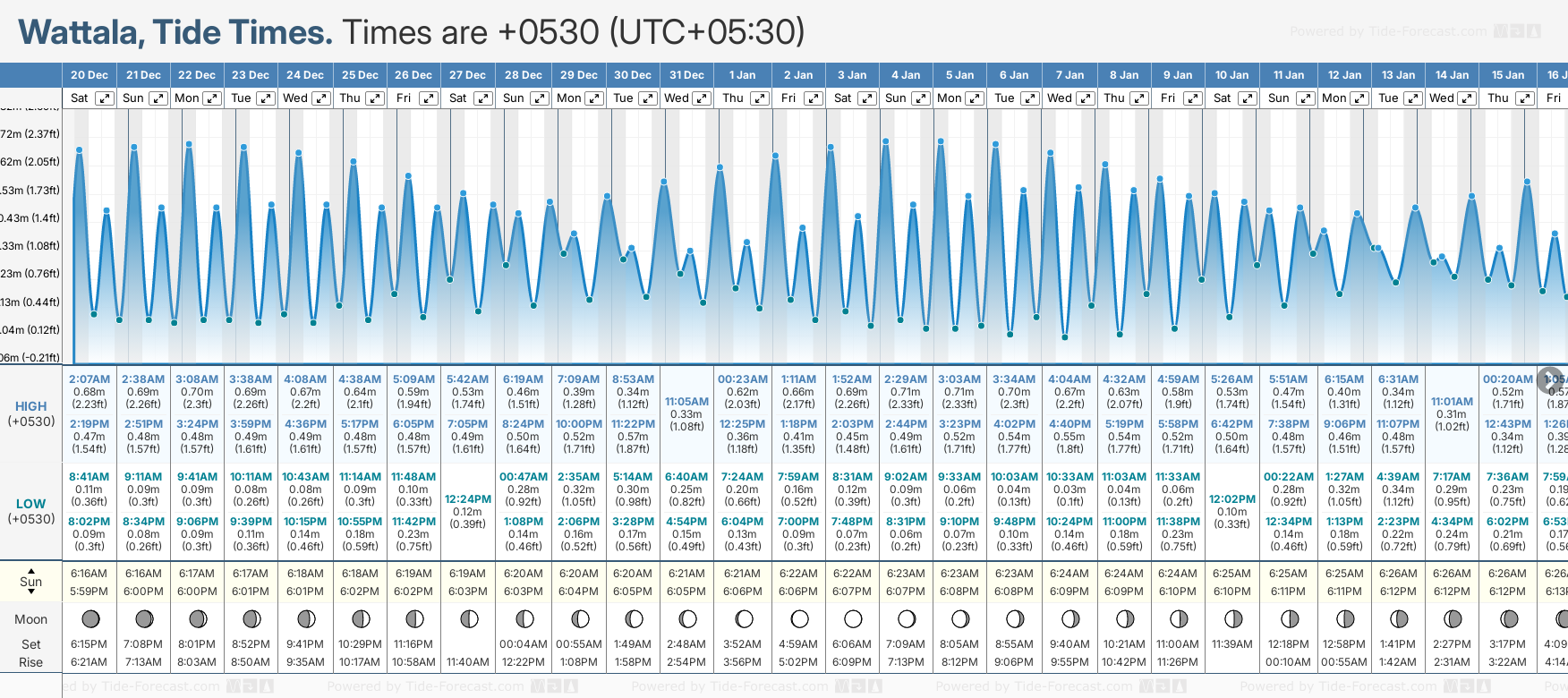 December and January Tide charts for Wattala: The tide charts below show the height, time and date of high and low tides for the next 30 days.