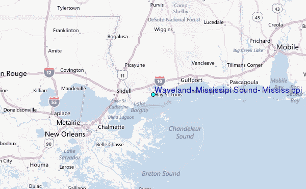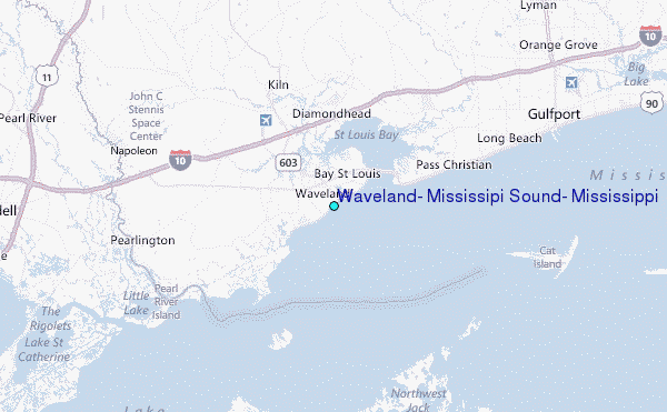 Use this relief map to navigate to tide stations, surf breaks and cities that are in the area of Waveland, Mississipi Sound, Mississippi.