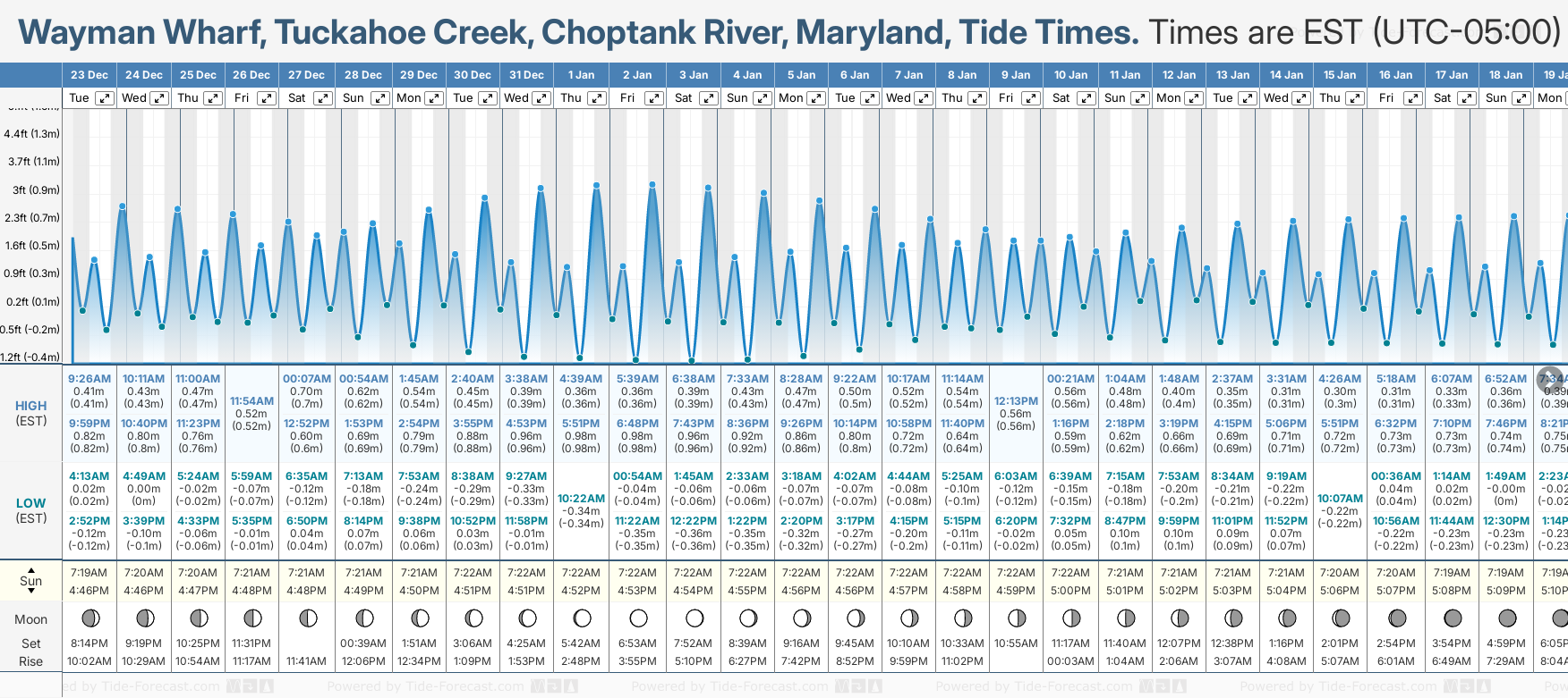 December and January Tide charts for Wayman Wharf, Tuckahoe Creek, Choptank River: The tide charts below show the height, time and date of high and low tides for the next 30 days.