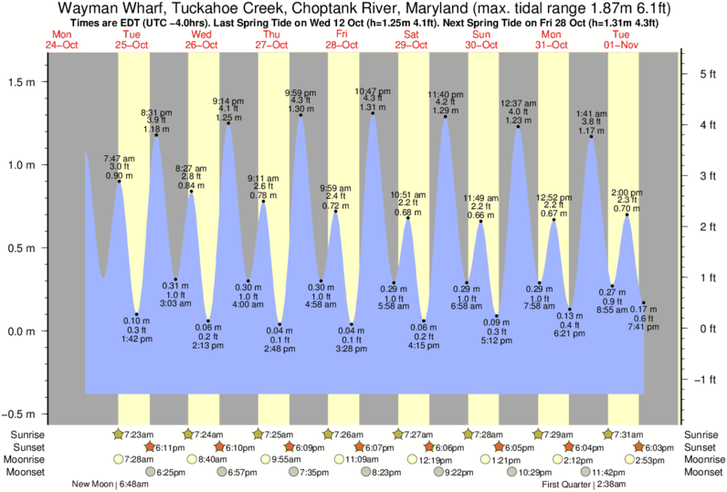 Tide chart for Wayman Wharf, Tuckahoe Creek, Choptank RiverShowing low and high tide times for the next 30 days at Wayman Wharf, Tuckahoe Creek, Choptank River. Tide Times are EST (UTC -5.0hrs).