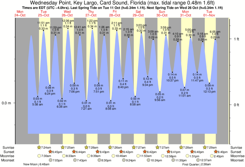Tide Times are EST (UTC -5.0hrs). Last Spring High Tide at Wednesday Point, Key Largo, Card Sound was on Thu 18 Dec (height: 0.25m 0.8ft). Next high Spring Tide at Wednesday Point, Key Largo, Card Sound will be on Tue 23 Dec (height: 0.25m 0.8ft).