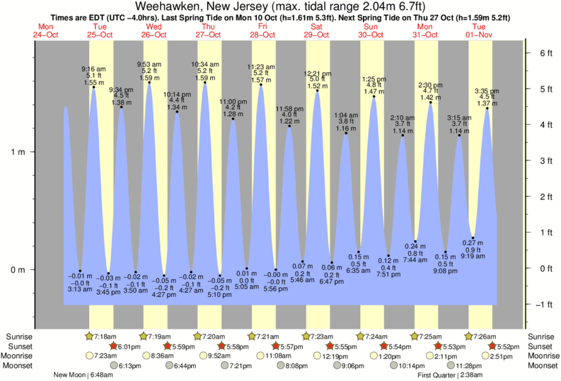 Tide Times are EST (UTC -5.0hrs). Last Spring High Tide at Weehawken was on Fri 19 Dec (height: 1.37m 4.5ft). Next high Spring Tide at Weehawken will be on Sat 03 Jan (height: 1.59m 5.2ft).