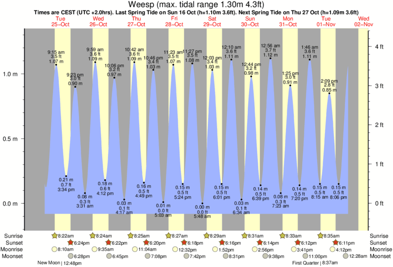 Tide Times are CET (UTC +1.0hrs). Last Spring High Tide at Weesp was on Wed 10 Dec (height: 1.20m 3.9ft). Next high Spring Tide at Weesp will be on Sun 28 Dec (height: 1.15m 3.8ft).