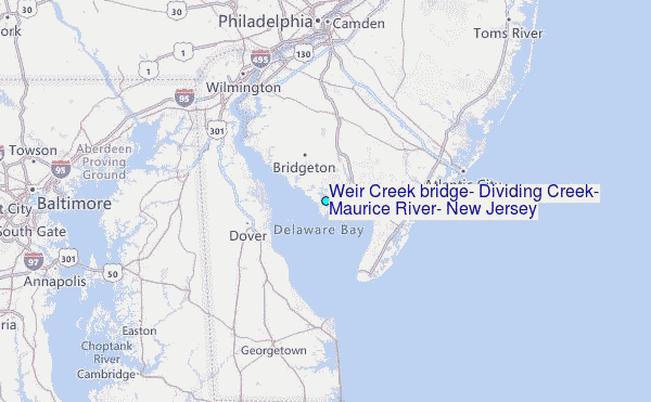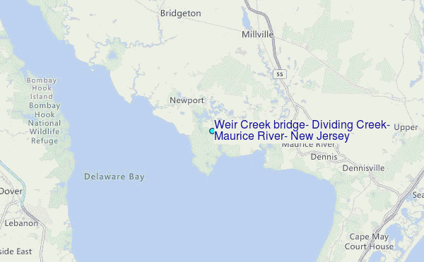 Use this relief map to navigate to tide stations, surf breaks and cities that are in the area of Weir Creek bridge, Dividing Creek, Maurice River, New Jersey.