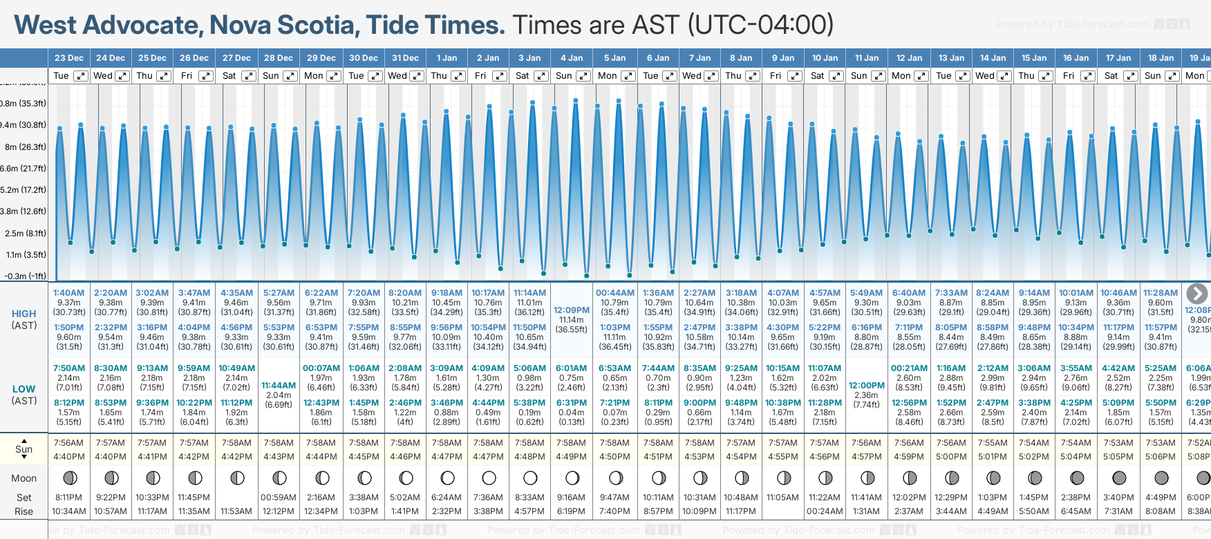 Tide Times are AST (UTC -4.0hrs). Last Spring High Tide at West Advocate was on Sat 06 Dec (height: 11.39m 37.4ft). Next high Spring Tide at West Advocate will be on Mon 22 Dec (height: 9.63m 31.6ft).