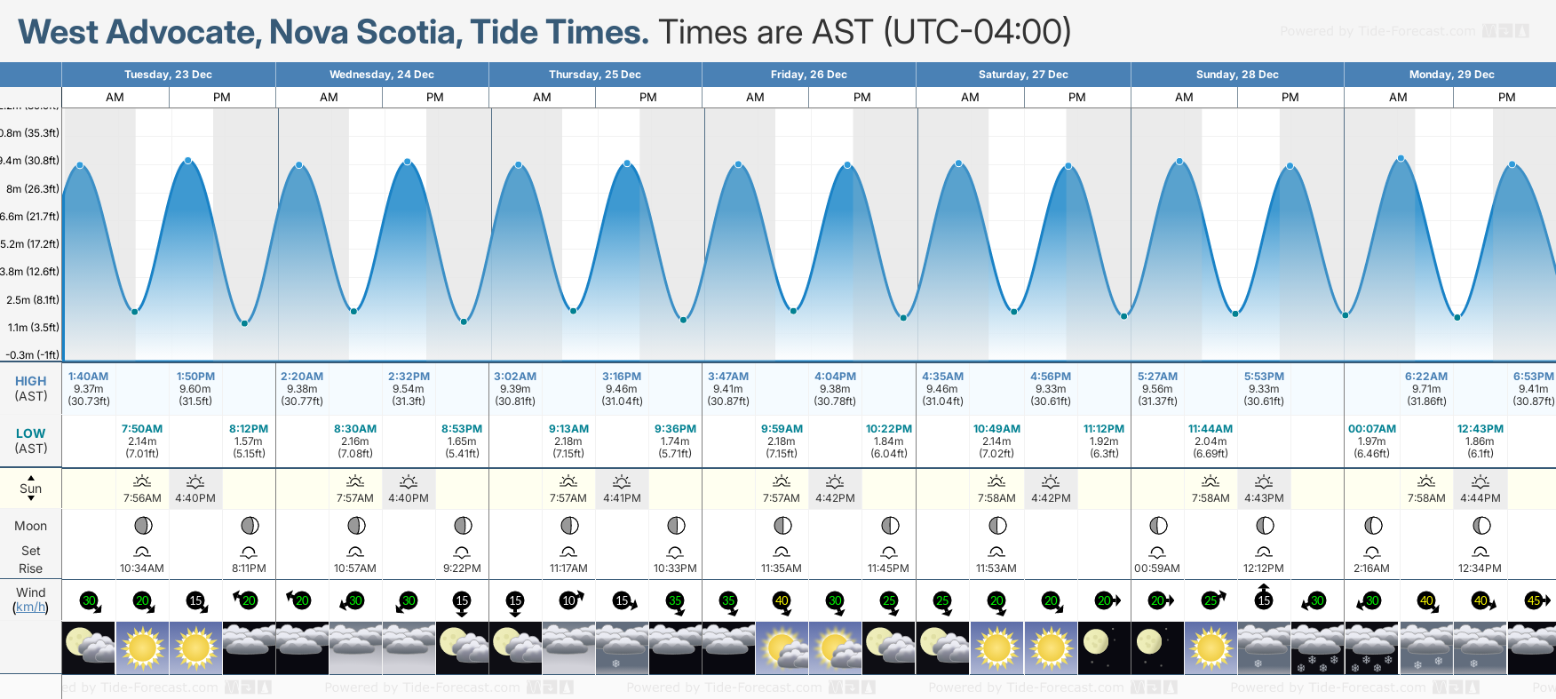 Tide chart for West AdvocateShowing low and high tide times for the next 30 days at West Advocate. Tide Times are AST (UTC -4.0hrs).
