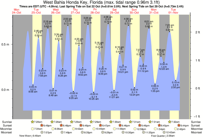 Tide Times are EST (UTC -5.0hrs). Last Spring High Tide at West Bahia Honda Key was on Sat 20 Dec (height: 0.55m 1.8ft). Next high Spring Tide at West Bahia Honda Key will be on Sat 03 Jan (height: 0.61m 2.0ft).