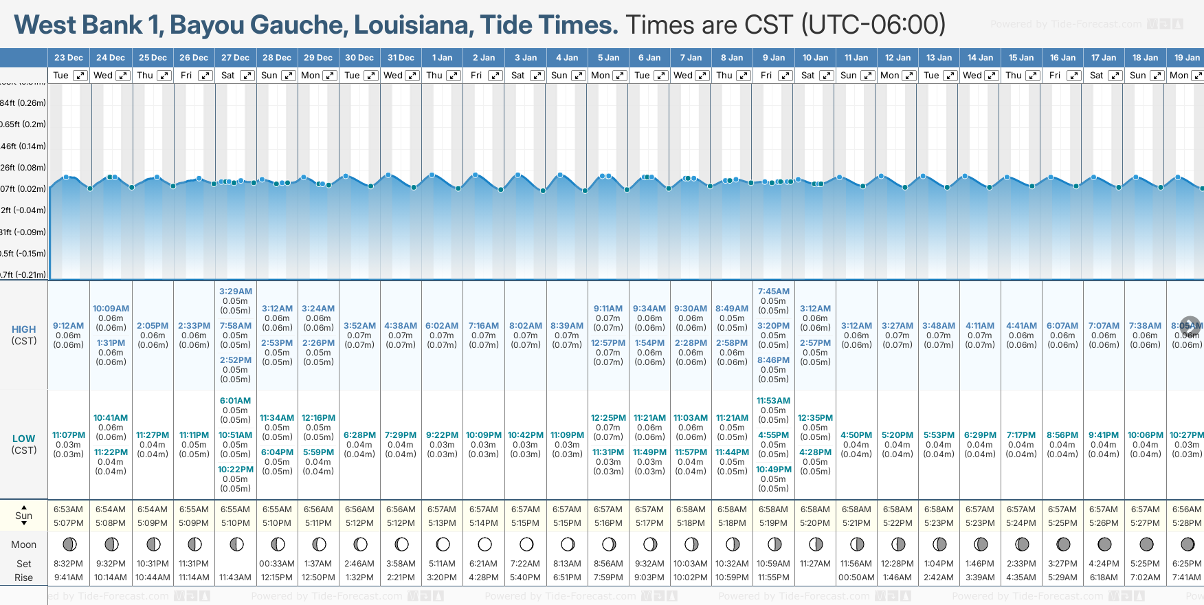 December and January Tide charts for Bayou Gauche: The tide charts below show the height, time and date of high and low tides for the next 30 days.