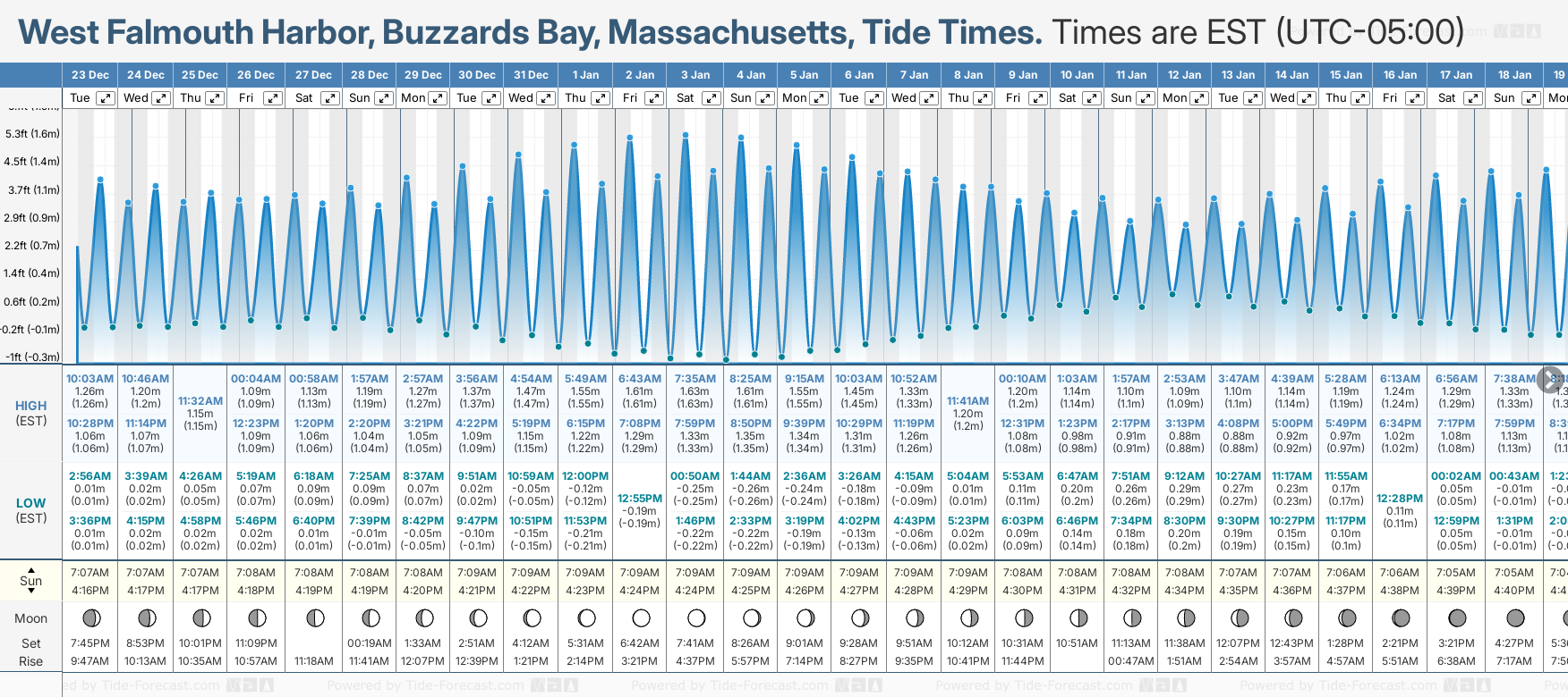 December and January Tide charts for West Falmouth Harbor, Buzzards Bay: The tide charts below show the height, time and date of high and low tides for the next 30 days.