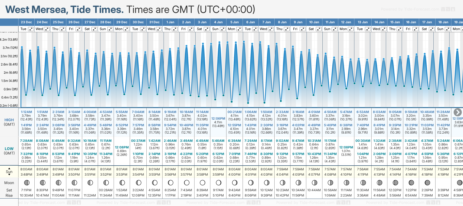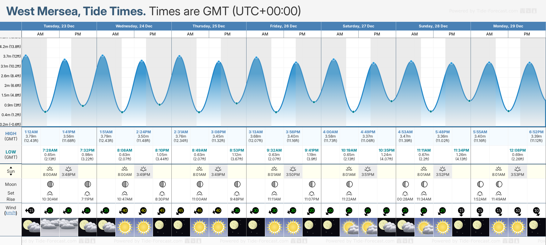 December and January Tide charts for West Mersea: The tide charts below show the height, time and date of high and low tides for the next 30 days.