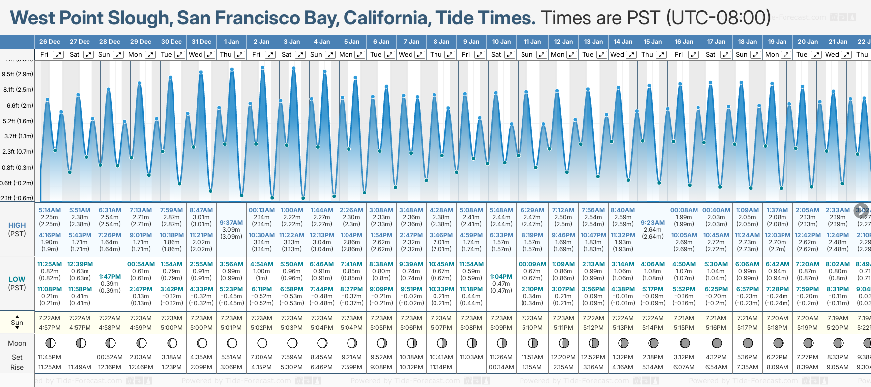 December and January Tide charts for West Point Slough, San Francisco Bay: The tide charts below show the height, time and date of high and low tides for the next 30 days.