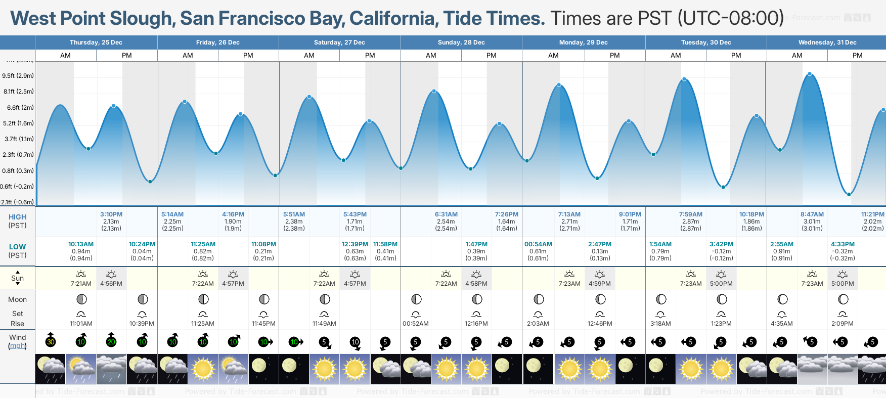 Tide chart for West Point Slough, San Francisco BayShowing low and high tide times for the next 30 days at West Point Slough, San Francisco Bay. Tide Times are PST (UTC -8.0hrs).