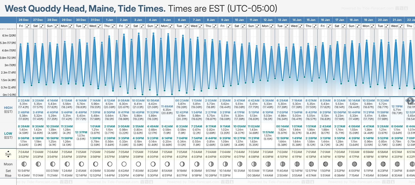 December and January Tide charts for West Quoddy Head: The tide charts below show the height, time and date of high and low tides for the next 30 days.