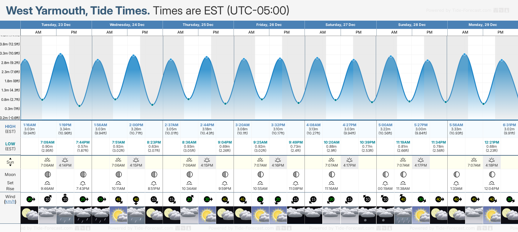 Tide chart for West YarmouthShowing low and high tide times for the next 30 days at West Yarmouth. Tide Times are EST (UTC -5.0hrs).