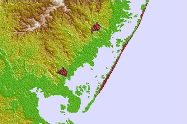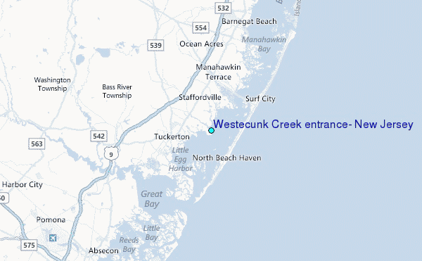 Use this relief map to navigate to tide stations, surf breaks and cities that are in the area of Westecunk Creek entrance, New Jersey.