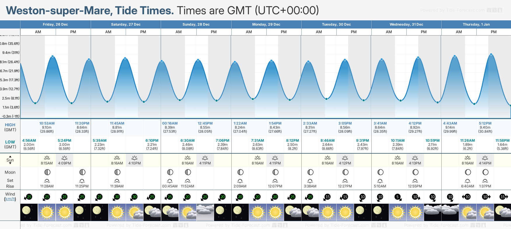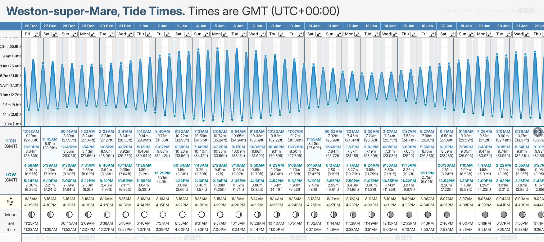 December and January Tide charts for Weston-super-Mare: The tide charts below show the height, time and date of high and low tides for the next 30 days.