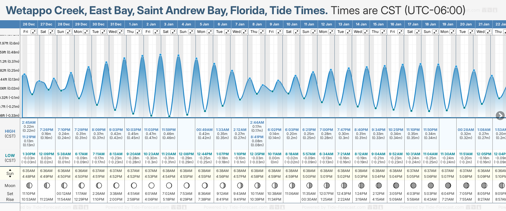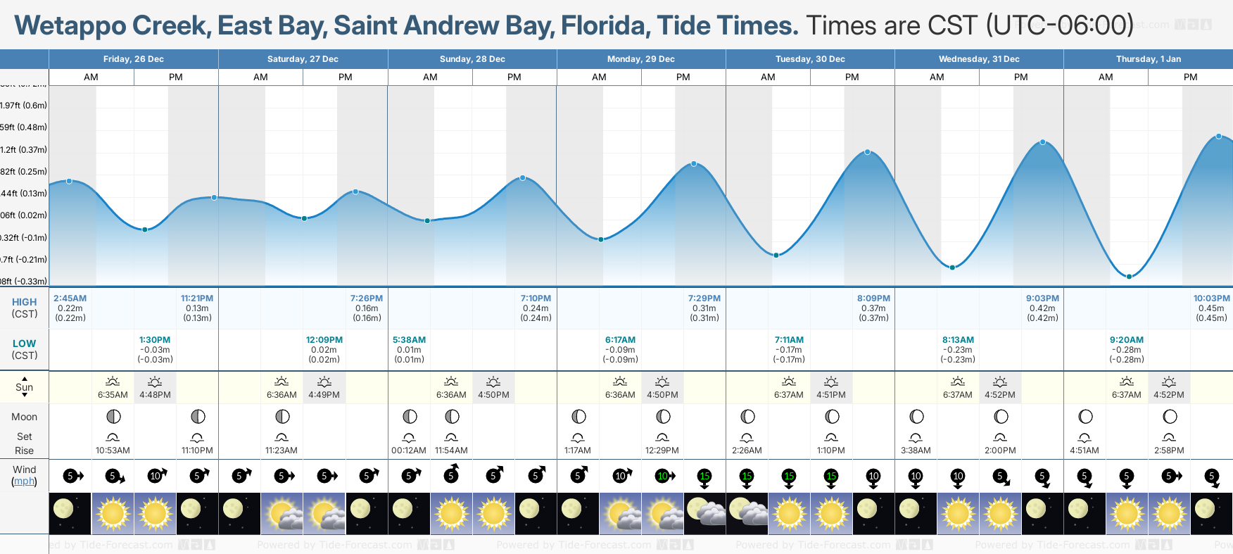 December and January Tide charts for Wetappo Creek, East Bay, Saint Andrew Bay: The tide charts below show the height, time and date of high and low tides for the next 30 days.