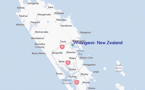 Use this relief map to navigate to tide stations, surf breaks and cities that are in the area of Whangarei, New Zealand.