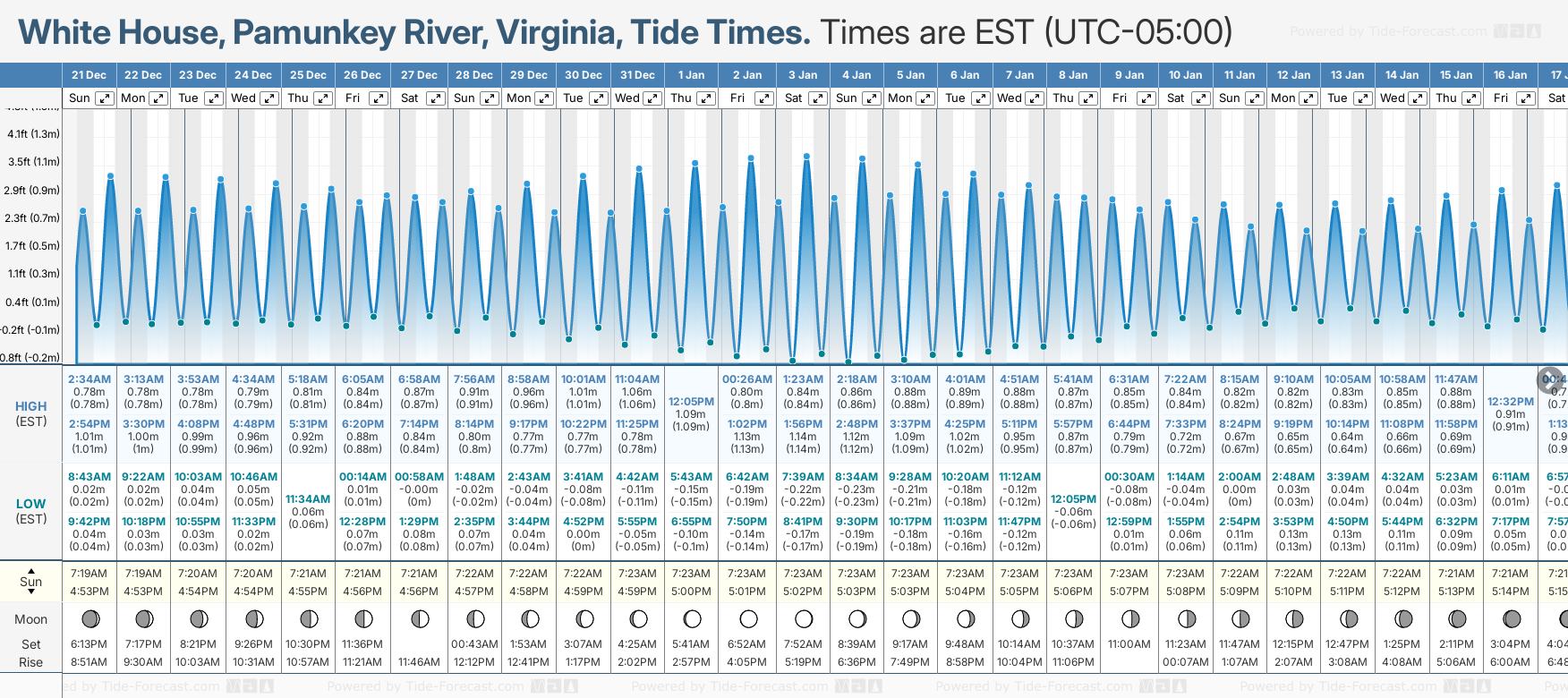 December and January Tide charts for White House, Pamunkey River: The tide charts below show the height, time and date of high and low tides for the next 30 days.