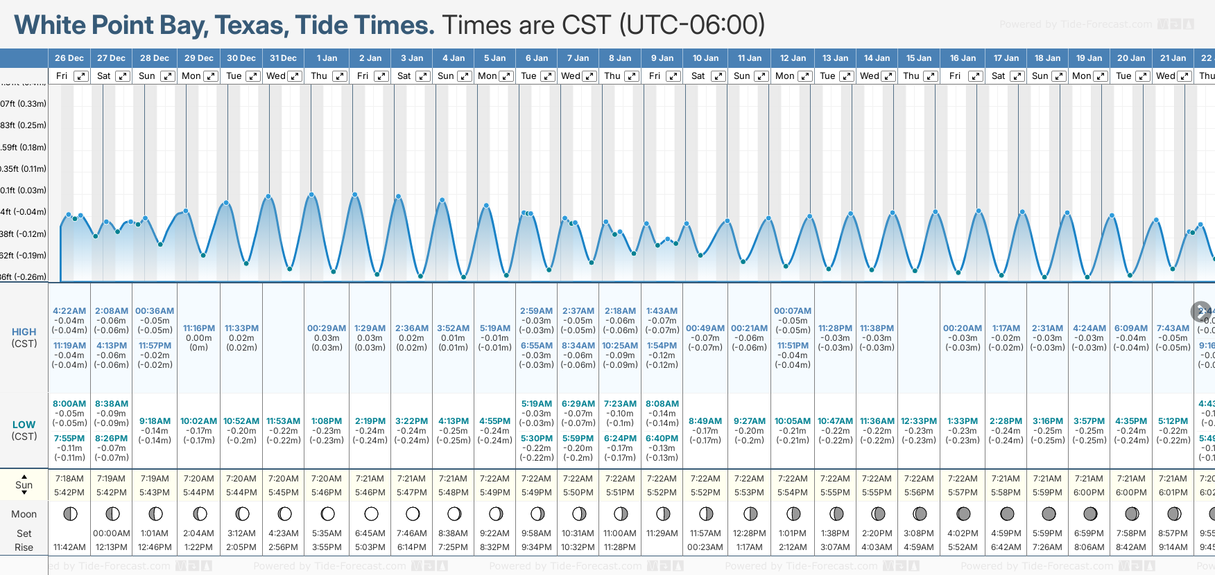 Tide Times are CST (UTC -6.0hrs). Last Spring High Tide at White Point Bay was on Fri 19 Dec (height: 0.07m 0.2ft). Next high Spring Tide at White Point Bay will be on Wed 31 Dec (height: 0.03m 0.1ft).