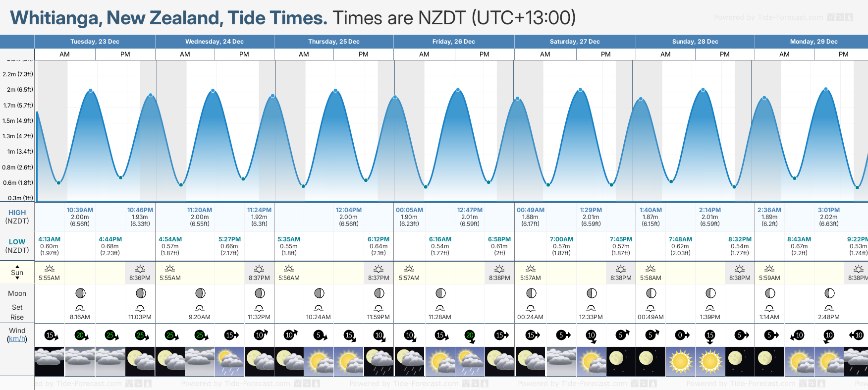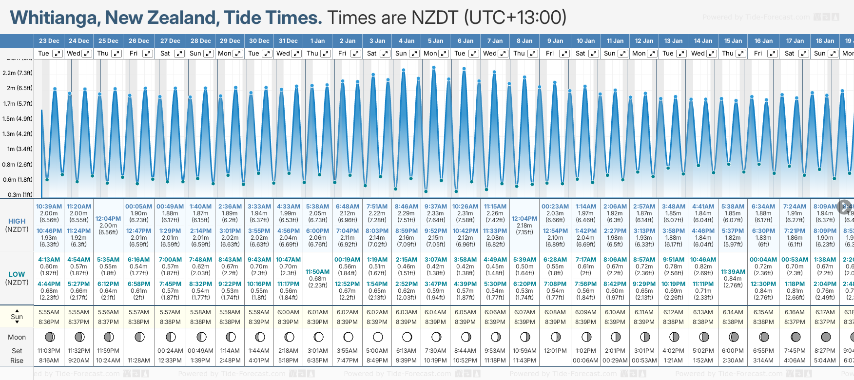 December and January Tide charts for Whitianga: The tide charts below show the height, time and date of high and low tides for the next 30 days.