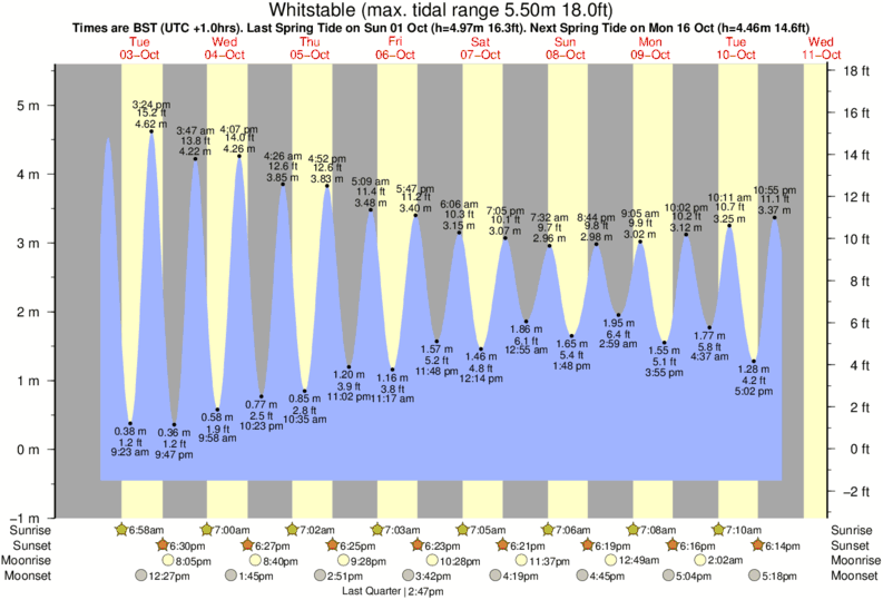Tide Times are GMT (UTC +0hrs). Last Spring High Tide at Whitstable was on Sat 06 Dec (height: 4.63m 15.2ft). Next high Spring Tide at Whitstable will be on Wed 24 Dec (height: 4.10m 13.5ft).