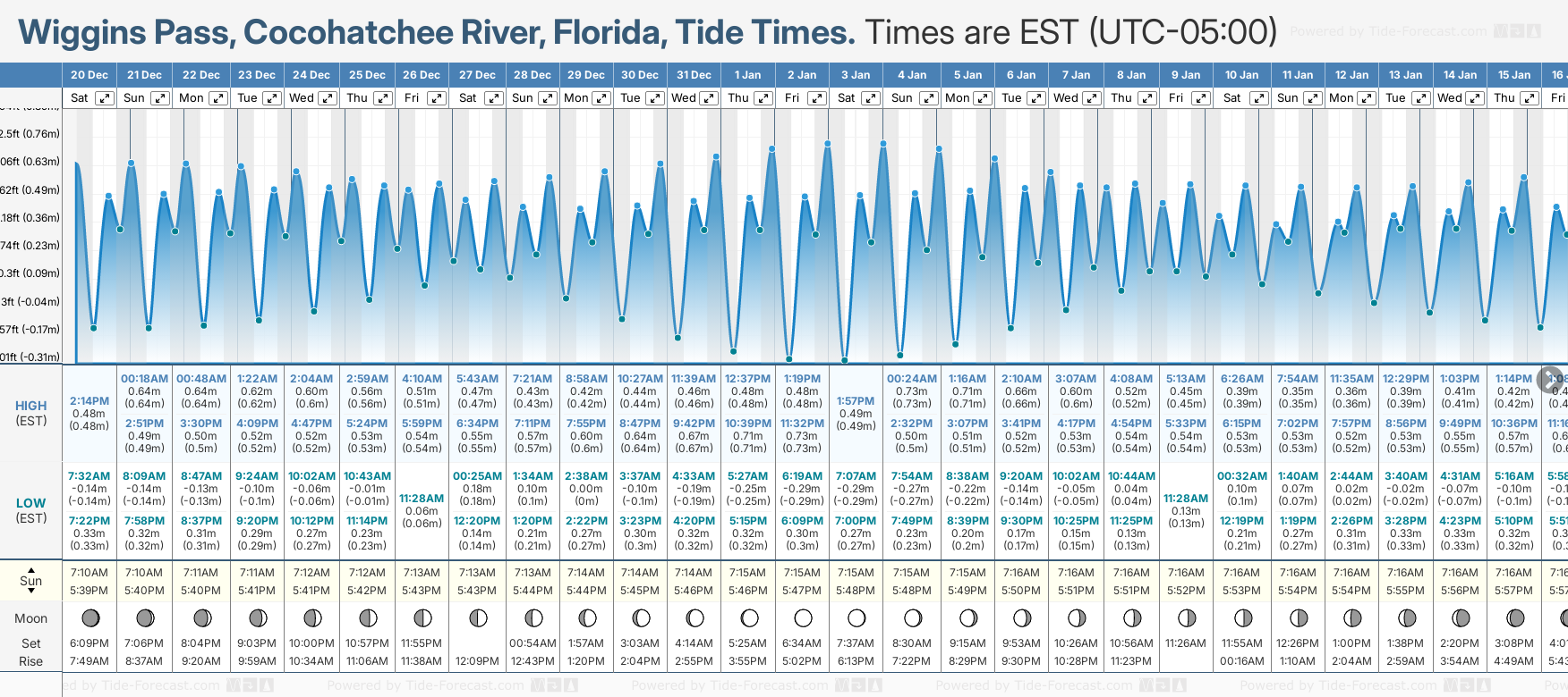 December and January Tide charts for Wiggins Pass, Cocohatchee River: The tide charts below show the height, time and date of high and low tides for the next 30 days.