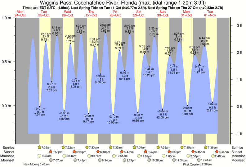 Tide Times are EST (UTC -5.0hrs). Last Spring High Tide at Wiggins Pass, Cocohatchee River was on Fri 19 Dec (height: 0.64m 2.1ft). Next high Spring Tide at Wiggins Pass, Cocohatchee River will be on Fri 02 Jan (height: 0.73m 2.4ft).
