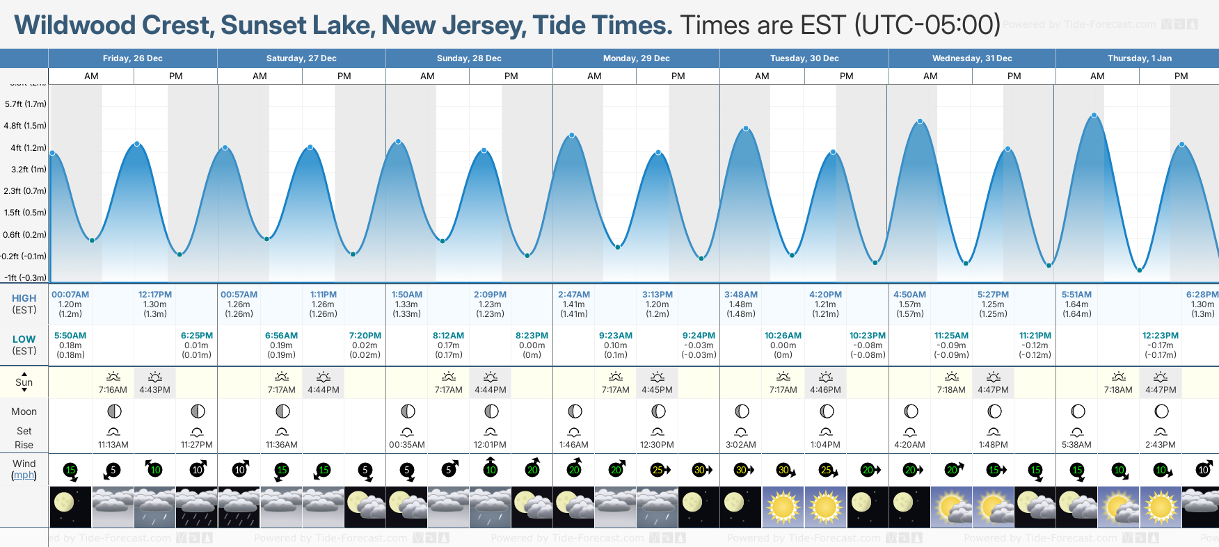 December and January Tide charts for Wildwood Crest, Sunset Lake: The tide charts below show the height, time and date of high and low tides for the next 30 days.
