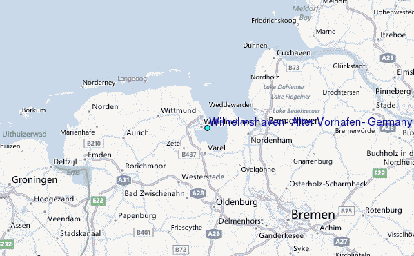 Use this relief map to navigate to tide stations, surf breaks and cities that are in the area of Wilhelmshaven, Alter Vorhafen, Germany.
