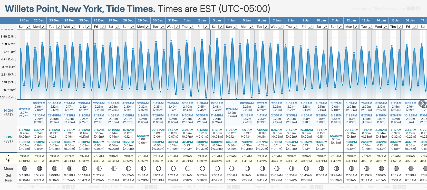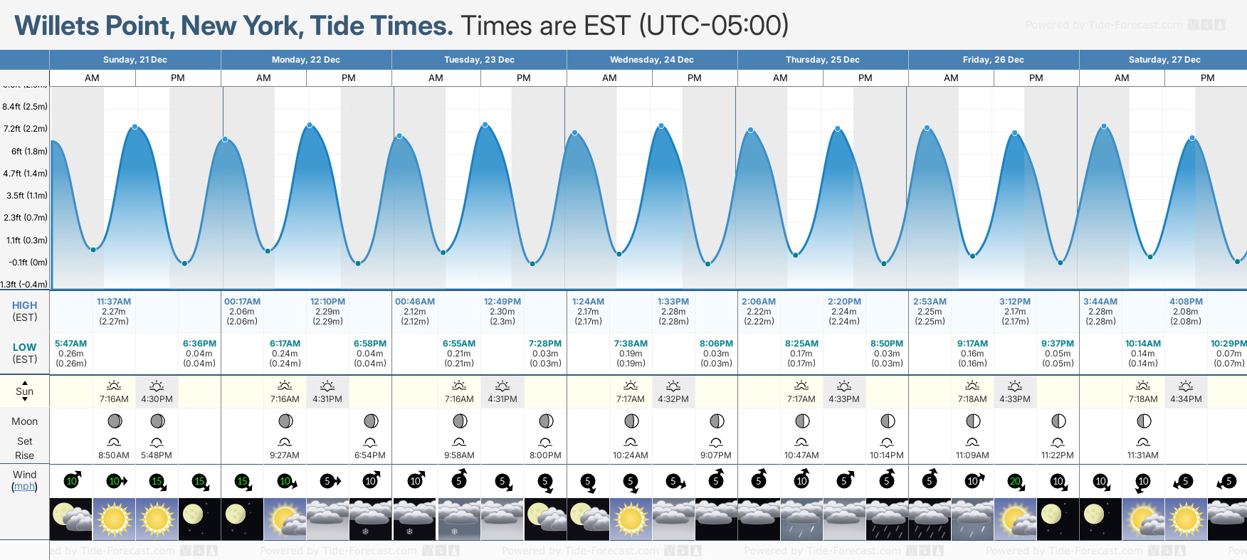 Tide Times are EST (UTC -5.0hrs). Last Spring High Tide at Willets Point was on Wed 17 Dec (height: 2.23m 7.3ft). Next high Spring Tide at Willets Point will be on Tue 23 Dec (height: 2.30m 7.5ft).