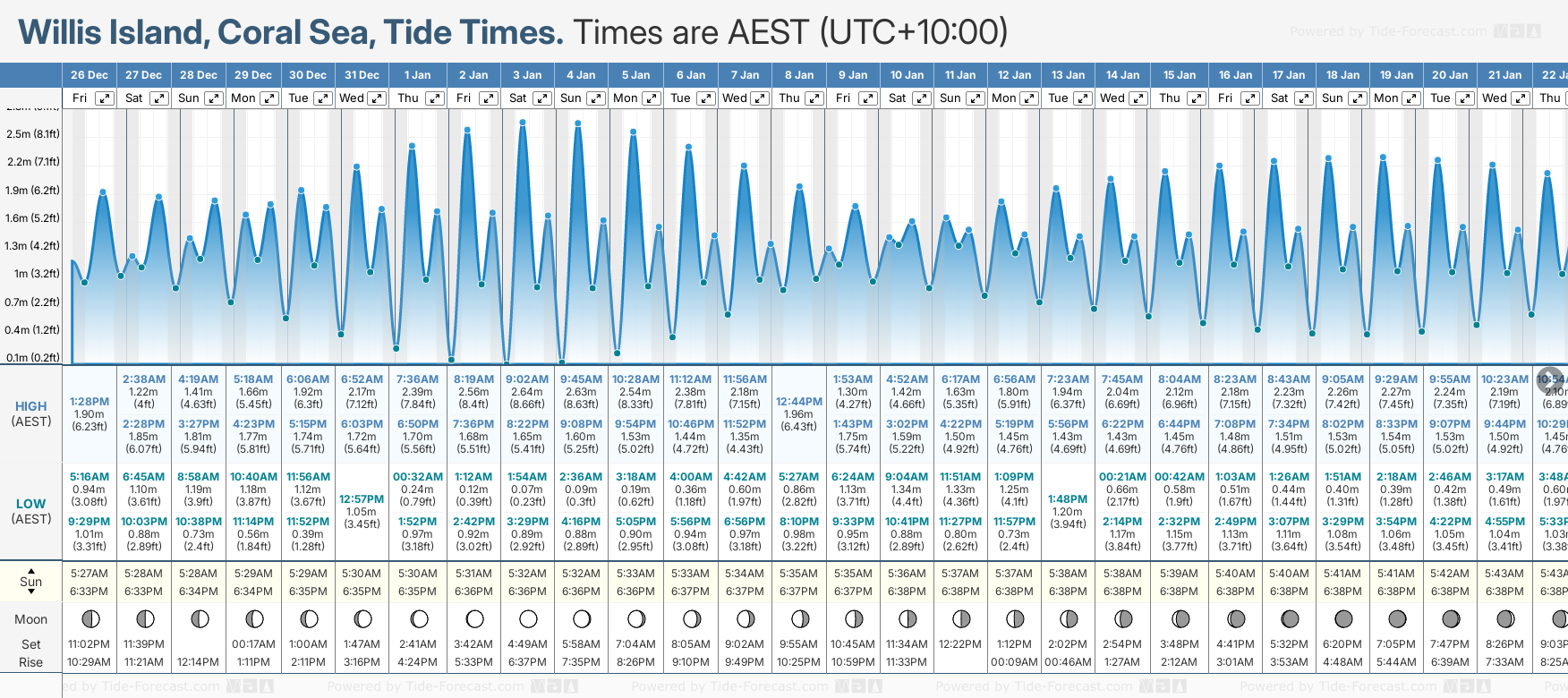 December and January Tide charts for Willis Island: The tide charts below show the height, time and date of high and low tides for the next 30 days.