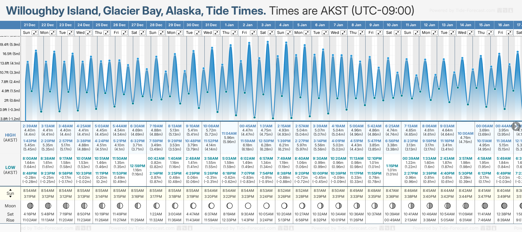 December and January Tide charts for Willoughby Island, Glacier Bay: The tide charts below show the height, time and date of high and low tides for the next 30 days.