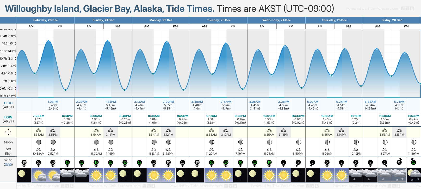 Tide Times are AKST (UTC -9.0hrs). Last Spring High Tide at Willoughby Island, Glacier Bay was on Fri 05 Dec (height: 6.46m 21.2ft). Next high Spring Tide at Willoughby Island, Glacier Bay will be on Sat 20 Dec (height: 5.46m 17.9ft).