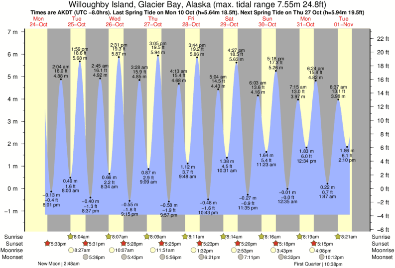 Willoughby Island, Glacier Bay tide chart key: The tide chart above shows the height and times of high tide and low tide for Willoughby Island, Glacier Bay, Alaska. The grey shading corresponds to nighttime hours between sunset and sunrise at Willoughby Island, Glacier Bay.