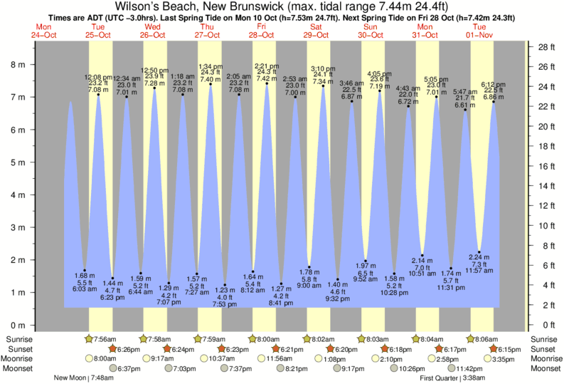 Wilson's Beach tide chart key: The tide chart above shows the height and times of high tide and low tide for Wilson's Beach, New Brunswick. The grey shading corresponds to nighttime hours between sunset and sunrise at Wilson's Beach.
