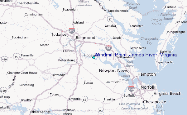 Use this relief map to navigate to tide stations, surf breaks and cities that are in the area of Windmill Point, James River, Virginia.