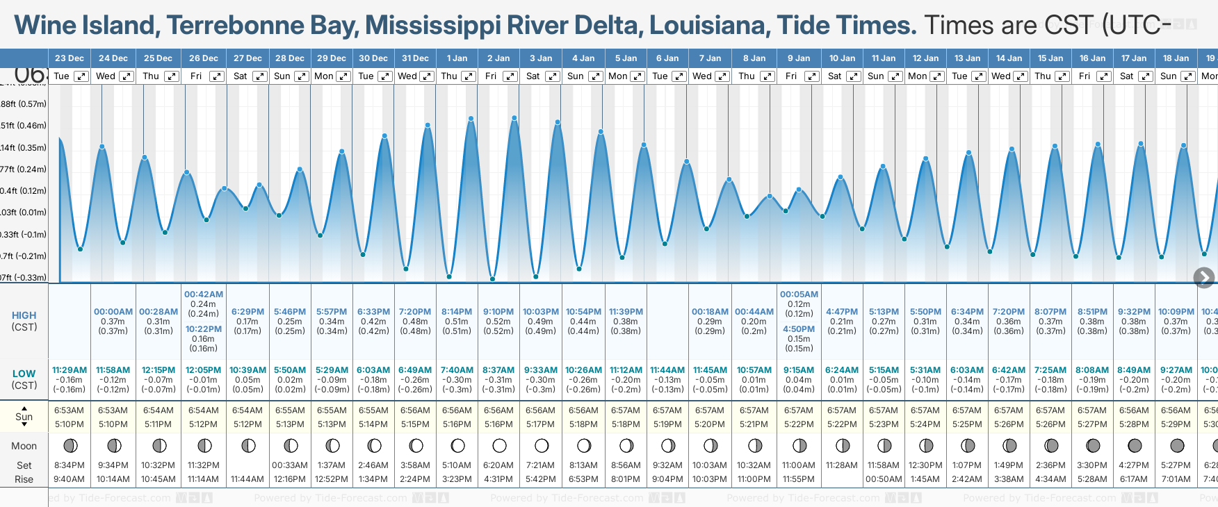Wine Island, Terrebonne Bay River Delta tide times for December and January