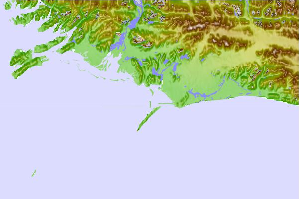 Use this relief map to navigate to tide stations, surf breaks and cities that are in the area of Wingham Island, Controller Bay, Alaska.