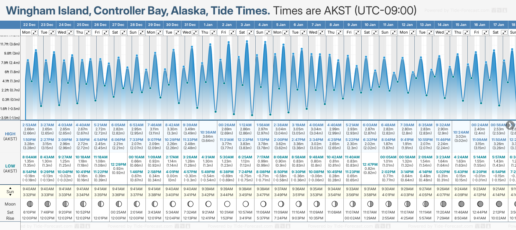 Tide Times are AKST (UTC -9.0hrs). Last Spring High Tide at Wingham Island, Controller Bay was on Sat 20 Dec (height: 3.35m 11.0ft). Next high Spring Tide at Wingham Island, Controller Bay will be on Sat 03 Jan (height: 3.83m 12.6ft).
