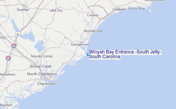 Use this relief map to navigate to tide stations, surf breaks and cities that are in the area of Winyah Bay Entrance (South Jetty), South Carolina.