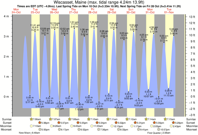 Tide Times are EST (UTC -5.0hrs). Last Spring High Tide at Wiscasset was on Fri 05 Dec (height: 3.69m 12.1ft). Next high Spring Tide at Wiscasset will be on Sun 21 Dec (height: 3.00m 9.8ft).