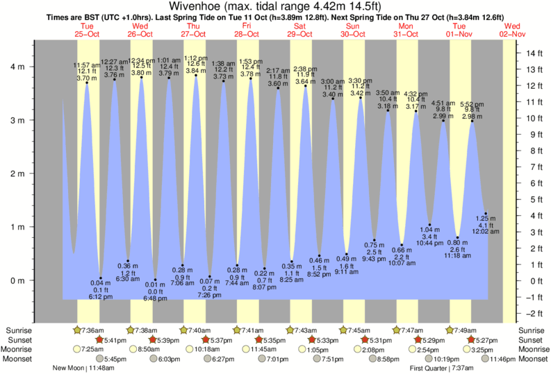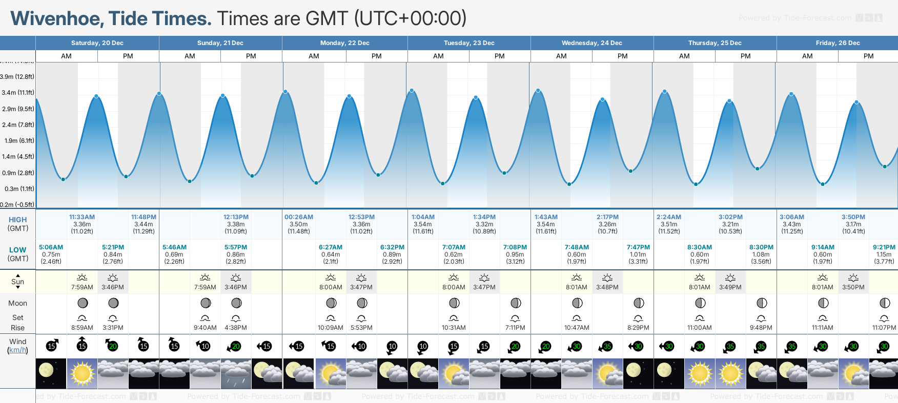 December and January Tide charts for Wivenhoe: The tide charts below show the height, time and date of high and low tides for the next 30 days.