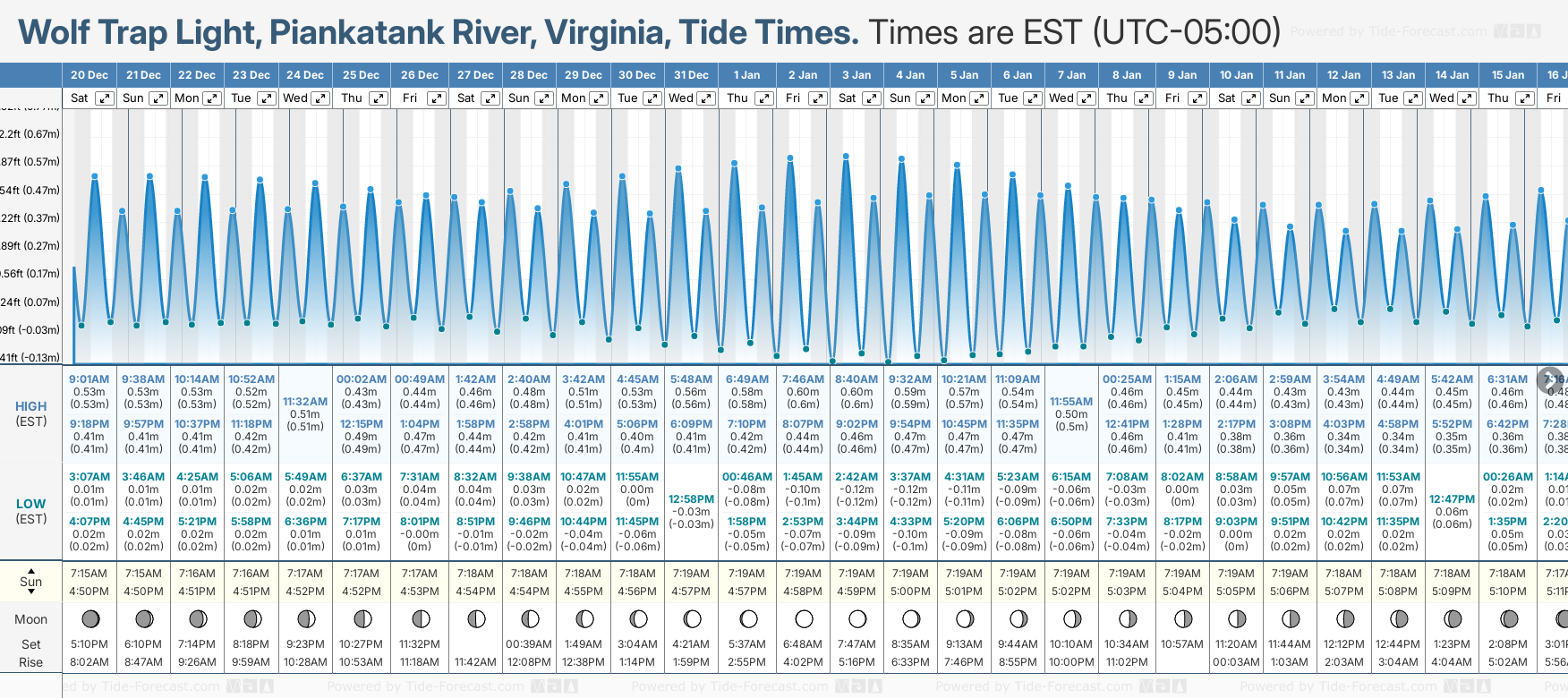 December and January Tide charts for Wolf Trap Light, Piankatank River: The tide charts below show the height, time and date of high and low tides for the next 30 days.