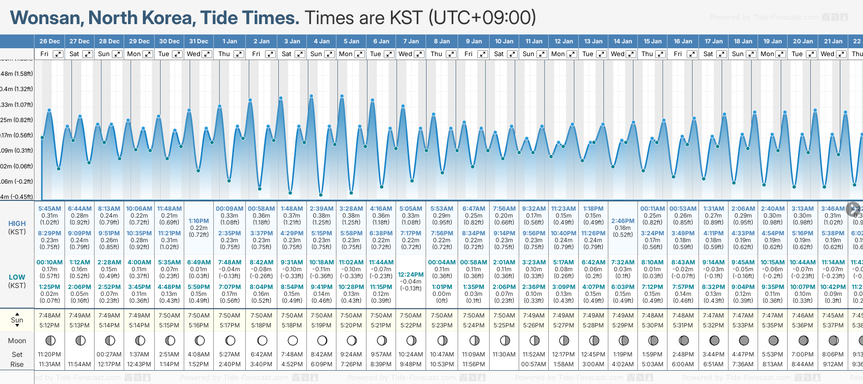 December and January Tide charts for Wonsan: The tide charts below show the height, time and date of high and low tides for the next 30 days.